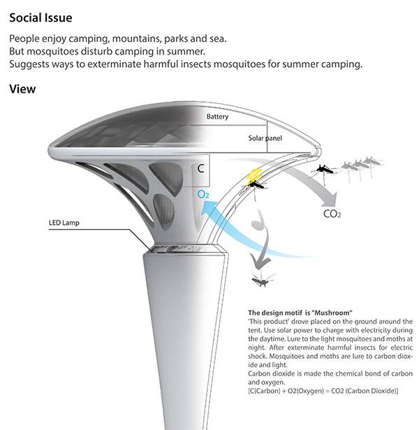 炎热的夏天,呆在屋子里会又闷又热,十分难受,因此很多的人都喜欢在这段时间出去露营。然而在露营的过程中,蚊虫的叮咬就成了一件非常烦人的事情。为了让大家的露营过程更加的舒服,为了避免蚊虫的侵扰,Dae Kwan Park等人设计了这个防蚊蘑菇。它的样子和野外的小蘑菇很像,当它被插在地上的时候就和普通的蘑菇一模一样了。在野外露营的时候,只要将它插在自己的帐篷里,它就会帮用户吸引并杀死那些讨厌的蚊虫。除此之外,它还拥有自动的太阳能充电功能,不应担心它会因为没电而停止工作。