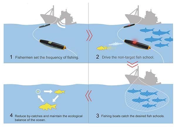 “竭泽而渔”很多渔民都知道这句谚语的意思,然而在打捞的过程很难保证不捞到小鱼,即使是选择网口较大的渔网,很多小鱼也很难逃出去。为了维持生态的平衡,也为了渔业的未来,JiaChen Du设计了一套避免捕捉到小鱼的捕鱼系统。当渔民洒下此网之后,先不收网,打开这个渔网中的警报器,它会发出特殊的声波,驱赶渔网中的小鱼,给它们充足的时间逃生。这样,当渔民收网的时候就能尽可能的捕捉体型较大的鱼了。这个设计既提高了渔业的捕鱼质量,又保护了海洋的生态系统,真是一举两得!