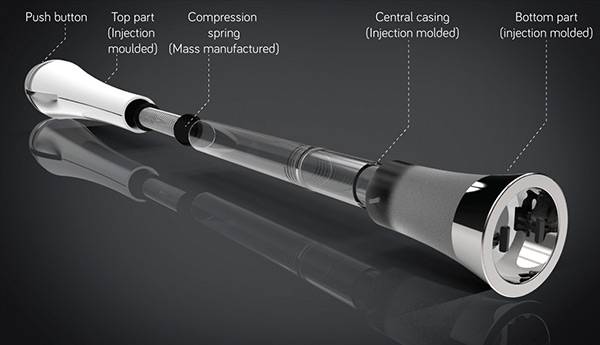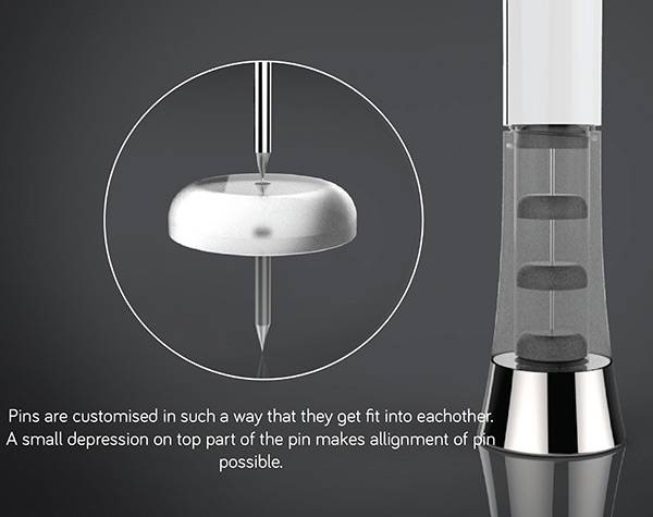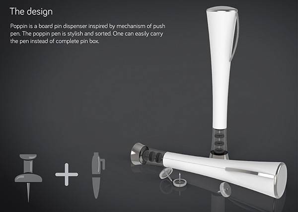 大头针对于我们来说是一个危险而又不常用的东西,所以很少会有人随身携带。但是当需要它往木板上钉东西的时候,它又非常的重要,因此它的携带和使用方式需要进行一次优化。为了用户能够更加方便和安全的使用大头针,Pranali Linge和Uttara Ghodke设计了这个大头针笔。用户可以整齐的将它排列在笔杆之中,使用的时候只需要将笔口对准需要钉的地方,从末端一按,就可以很轻松将纸张钉在木板上,非常的简单,便捷。