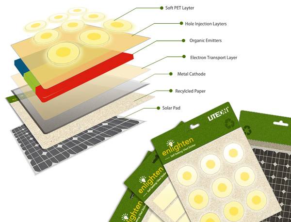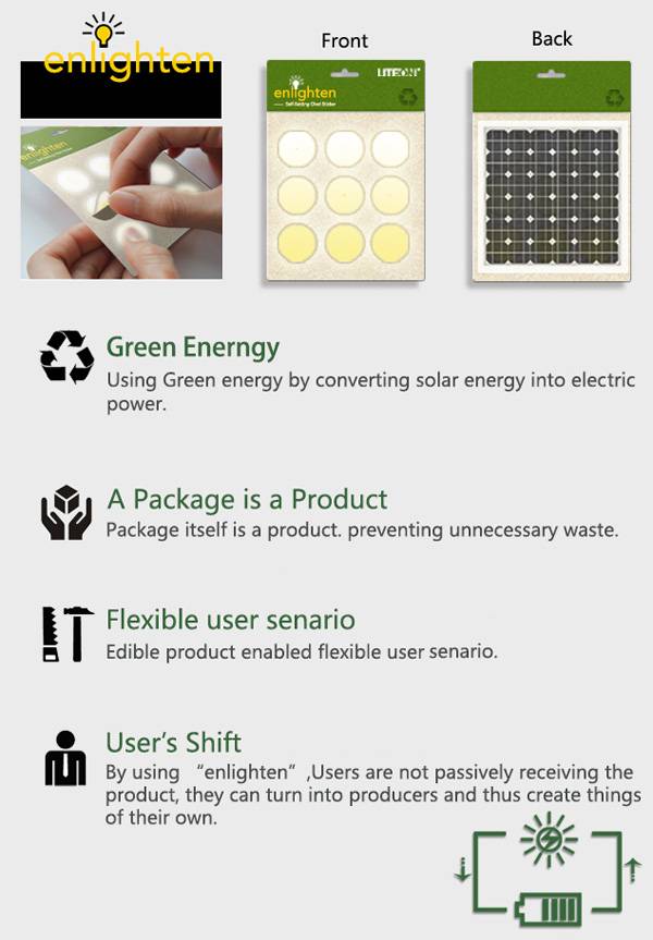 随着时代的发展,用户对于的生活的理解的变化,夜生活变得越来越普遍,越来越大众化。因此为了方便广大用户的夜生活,Si Qian He和Ding He设计了这个无处不在的光照明工具。这个设计最大的特点就在于它的便携,甚至向纸一样薄,像指甲盖一样大,只要轻轻一贴,轻轻一按,它就会为用户带来光亮。用户可以将它贴在任何方便的地方,衣服上,帽子上,为用户的出行带来极大的便利。也可以组合起来贴在桌子生,墙上,背包上,当做装饰的效果也非常的不错。