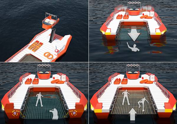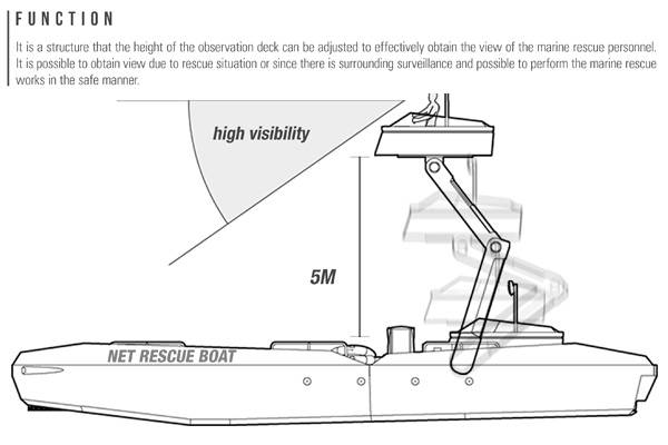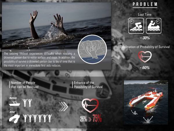 大海是一个广阔,神秘,多变的地方,虽然它非常的美丽,但有的时候它也会带来危险,因此方便,快捷,高效的救援艇是非常必要的。Jaehyo Lee和Wonkyung Jang设计的水网救援艇打破了之前所有救援艇的设计,也开创了一个全新的水上救援方式,水网救援。这种救援挺采用了类似铲子的形式,可以较为快速的将遇难的人从水中救起。因为水网是在水面之下,遇难的用户可以很容易的被铲起来或者自己爬上去。虽然上了船还是在水中,但是已经非常安全了。这样的设计不但可以节省救援时间,同时还增加了救援艇的救援人数,只需要两个人,就可以驾驶它救起很多的遇难者。