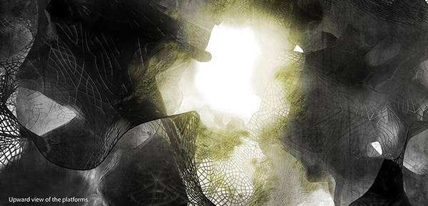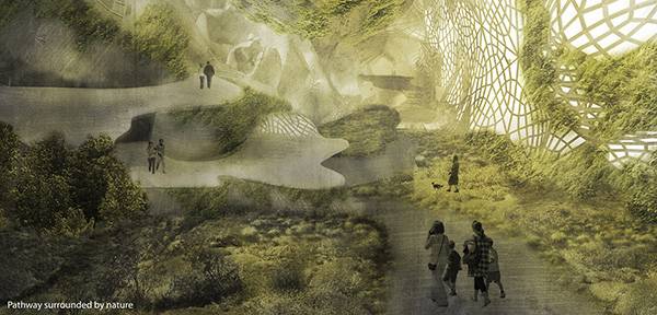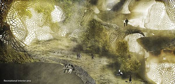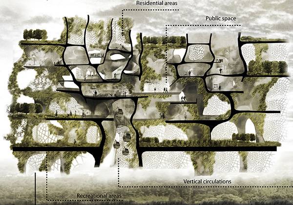 当有一天你在它的里面散步的时候,你可能意识不到它是一个摩天大楼,你可能会认为它是一个风景秀丽的公园。这个Re Silience生活摩天大楼为未来的公园设计开辟了新的道路,它能够利用最小的土地占用面积,达到更大的绿化效果。它的灵感来源于自然界中的蜂窝、珊瑚礁和蚁巢,设计的重点在于充分的利用城市里所缺少的土壤和生物,给大家一个散步休息的空间。