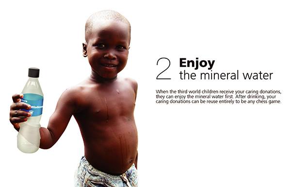 水和智慧是一个慈善项目,是为了给非洲贫水地区的孩子们送温暖而设计的。对于那些缺水地区的孩子们来说,他们却的不只是水,还需要智慧,需要改变现状的智慧,所以当我们给他们送去水的同时也要将智慧送给他们。这个设计是将象棋的所有零件融入到了送水的材料当中,变废为宝,将装水的箱子变成了棋盘,将瓶盖变成了棋子,这样他们就可以在娱乐的过程中开发自己的智慧,让他们的身心都能得到健康的发展。