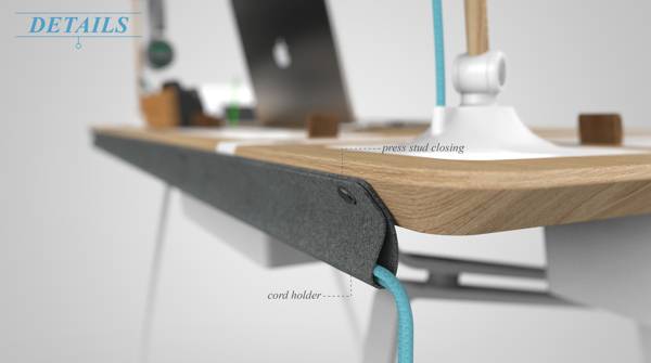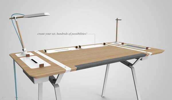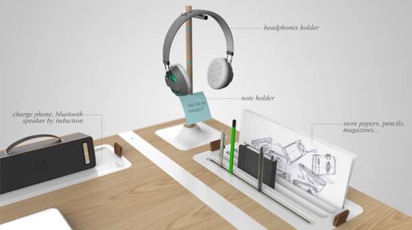当你的书桌上有很多东西的时候,你会不会感觉有些凌乱呢?特别是那些长长的电线。Francois Dransart为了解决这个难题,设计了这款概念书桌,系统化规范化的管理了你的书桌,让你的书桌变得整洁。这个书桌将几乎所有的可能放在上面的东西进行明确的定位,桌面上内置的几个储蓄仓,可以把一些不必要的东西收纳到里面,那些杂乱的电线都可以藏到桌子下面的电线袋中。很快你会发现你的书桌上多出了很多的空间,而且一点都不影响你的使用,反而让你用起来更加的舒服。
