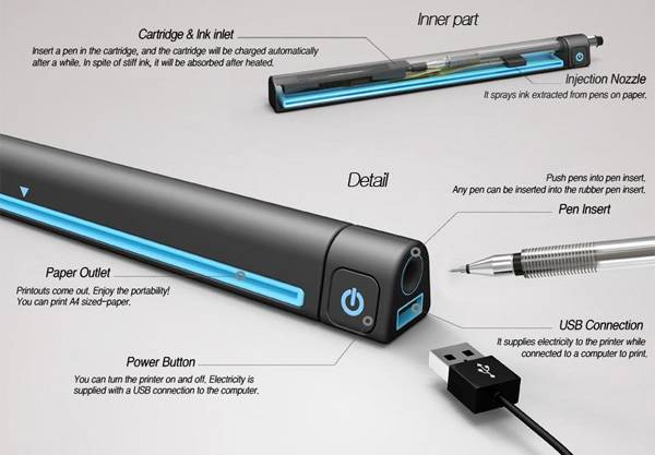 因为打印机的出现,现在人们使用笔的次数越来越少。但笔是永远不会被替代的,他是纸面语言的象征,既是你不用它,他也不会从你的脑海里消失。Tae-jin Kim和Su-in Kim设计的这款钢笔打印机为了表达时代的变迁,科技的进步,将打印机的形态缩小成了一个笔的大小,虽然现在的技术还不能实现这个雄心勃勃的想法,但是这个伟大的探索一定会在未来的某一天实现。