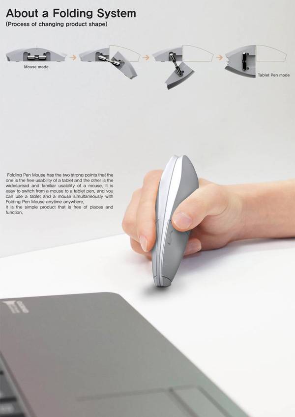 和鼠标相比,电子笔的使用次数远远小于鼠标,但是在绘画的时候电子笔却比鼠标好用的多。当你想使用电子笔的时候,是否会遇到找不到它的情况呢!Yoon Son设计的这款折叠笔鼠标是电子笔和鼠标的完美结合,特殊的折叠结构,让鼠标和电子笔的形态轻松的转换,既不影响鼠标的使用,又能很好的完成电子笔的功能。