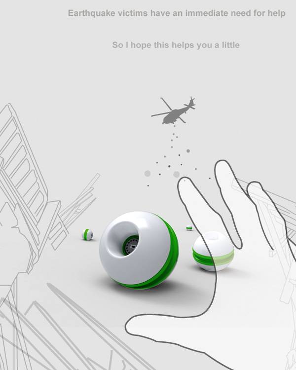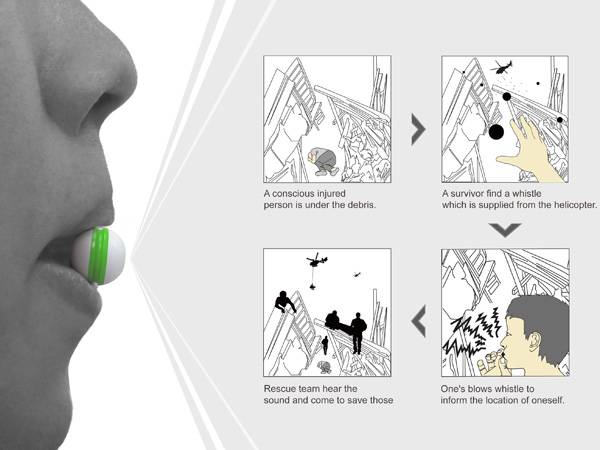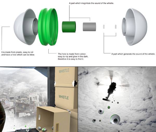 最近中国的水患很厉害,也因此死了不少人。每当我们面对这样的灾害时,除了应该积极救援以外,更应该总结经验,找出导致这些灾难的原因,特别是把好工程质量关。当面临地震这样的灾害时,灾后的幸存者搜救工作非常牵动人心,不过要想找到被埋在地下的人可不容易,高科技的生命探测仪一般也不可能大规模的使用,所以需要想其他的办法。这款小巧的球形口哨就是一个蛮可行的办法,它非常的小,结构简单成本也很低。更重要的是它的使用方式,不是依靠人们在平时主动备好,而是在灾难发生后由飞机像撒种子一样撒在可能有人的地方。因为口哨是球形的,所以它们很容易经过废墟中的空隙落在被埋者的身旁,这样幸存者就可以用这个口哨不费力地寻求救援了。