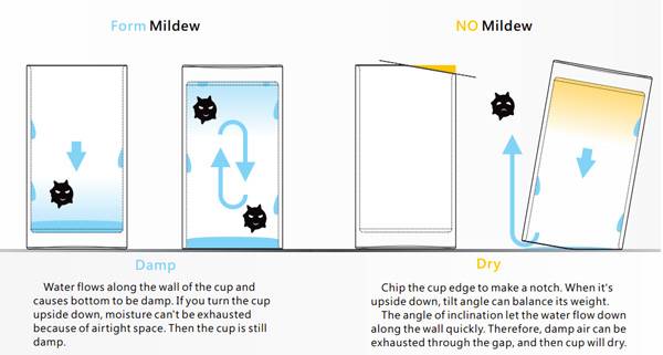 有不少产品都是用来是杯子、餐具快速干爽的,因为水分停留在杯子或餐具上的时间越长就越容易滋生细菌。相对来说,比起依靠其他工具辅助帮助杯子和餐具保持干爽,能够通过改进自己设计而又不会对原有功能产生影响是值得推荐的。这款 Tilt Cup 就是简单将杯口的一部分设计了一个斜角,其结果就是不会影响平时的饮用,倒置时杯子里的水会快速流出并且干燥,有效防止细菌滋生。