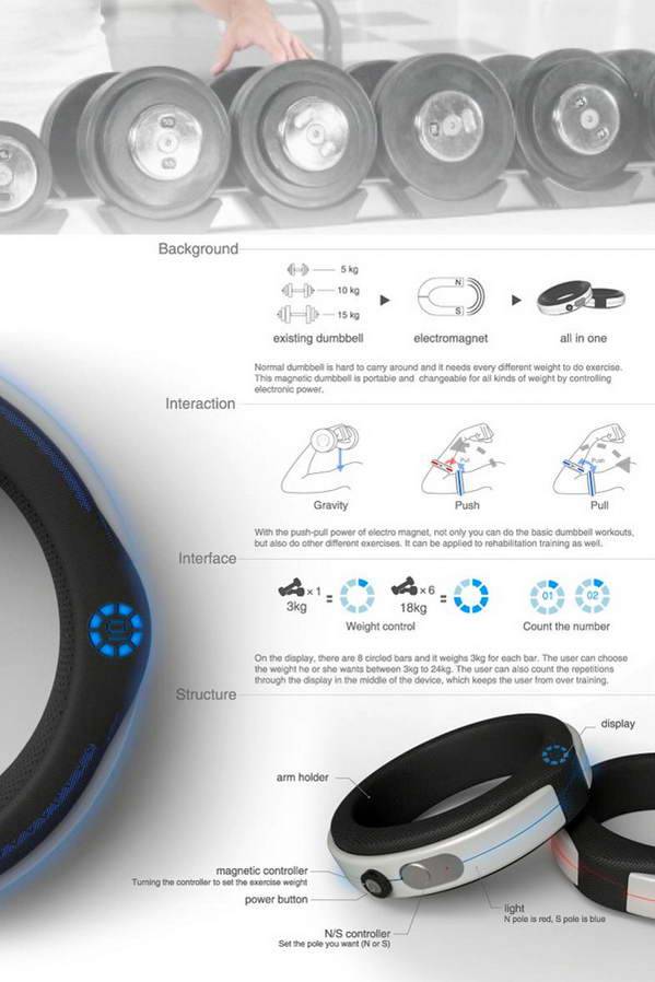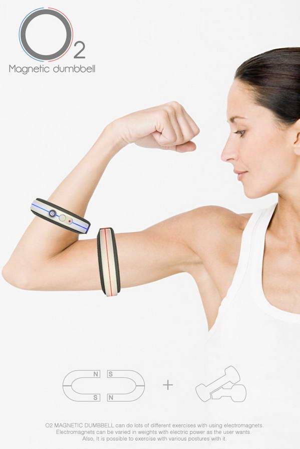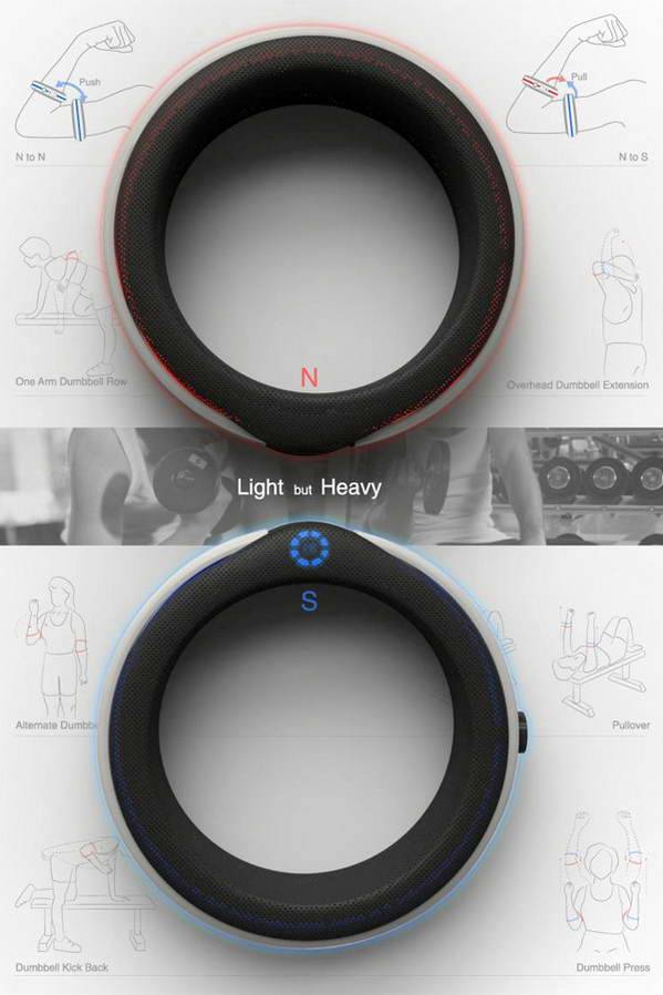 哑铃是我们平时用来锻炼身体的东西,因为体积比较大所以携带起来不是很方便,这是一款轻便的磁性哑铃,你甚至可以随身携带它,而且运输起来很方便,使用的时候只需要打开磁性开关,两个薄片的哑铃产生的吸力相当于我们正常使用的哑铃,还可以调节磁性的大小,很有创意的产品设计。