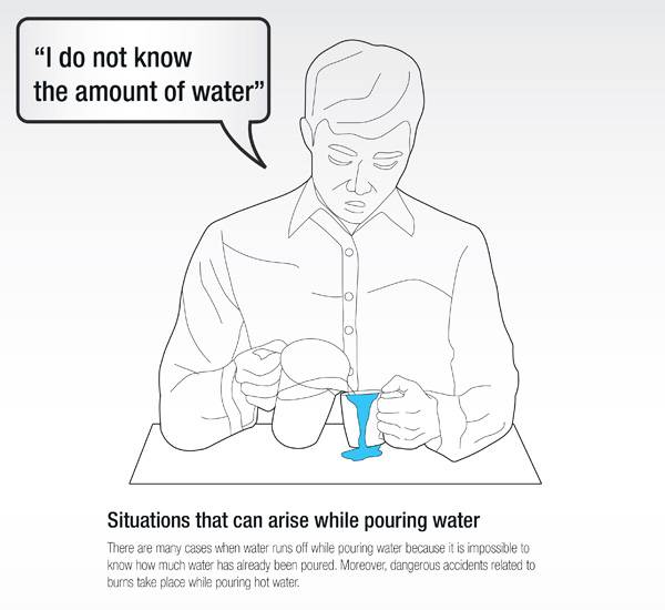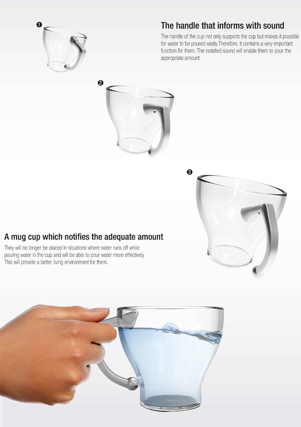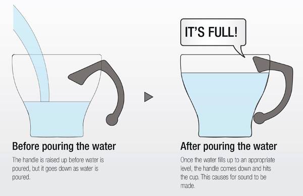不少电视里都有演员由于心神不定把水倒溢出的情节,而现实生活中,很多视力障碍人士也会不小心把水倒太多。这款 Xylophone 木琴水杯就是为了解决视力障碍人士的这一问题而设计的。它有一个活动的把手,把手的上端被伸入杯子里面。当水添到把手上端时会浮力会是把手上浮,从而把手下方就会敲打杯体发出声音。这样就起到提醒的作用了。