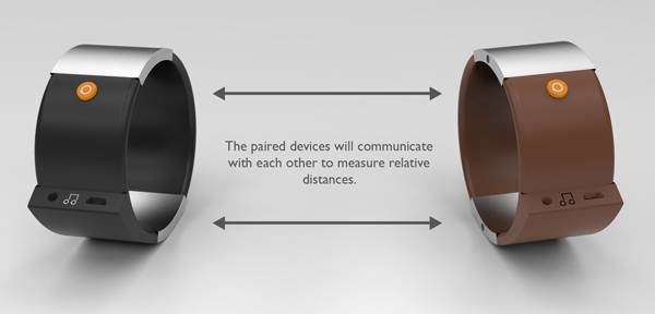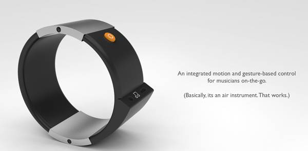 这款 Soundbrace 腕带设计。它有两只,分别用来感知用户两只手的动作,使用前需要在真吉他上学习用户的个人使用习惯,而后就可以根据腕带内置的加速度计等传感器检测用户手势,来发出相应声调。