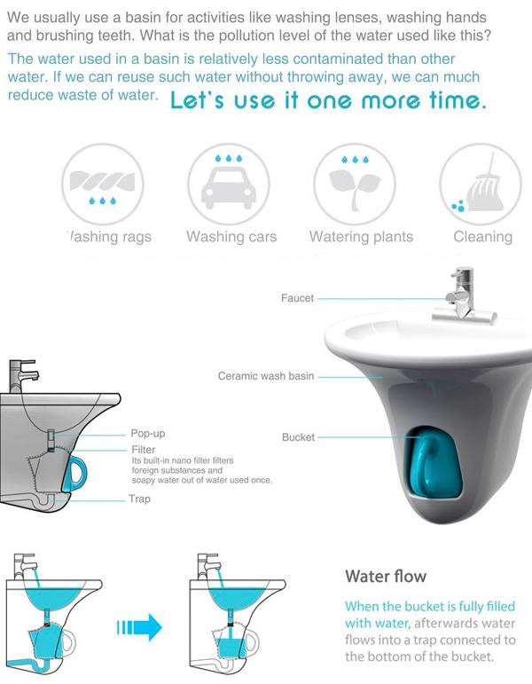 回收生活用水的概念并不新鲜,但是一直没有一个真正能够快速普及到家庭的好设计,原因是多方面的,可能是认识的问题,习惯的问题,成本的问题等等。这款 Ponding 面盆也是基于简单回收生活污水而设计的,它提供了一个低成本的方案,即通过在面盆上放置一只水壶,污水经过过滤后流入壶中从而人们可以利用这些水来洗车、浇花什么的。