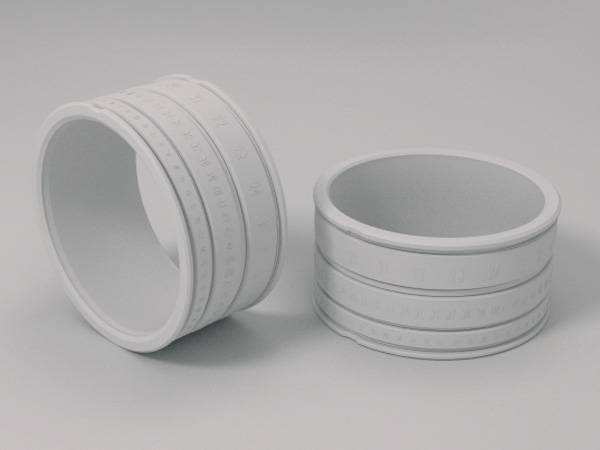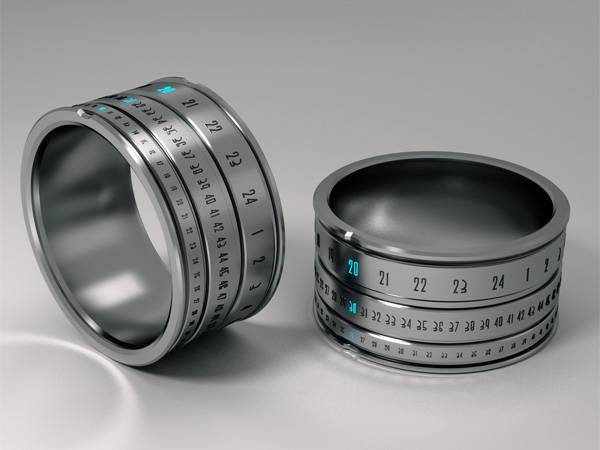来自设计师Szikszai Gusztáv的创意,时间戒指(Ring Clock)上面有三个粗细不一的同心圆环,最粗的是小时数,次之是分钟数,最细的则是秒的读数。而戒指上面有一个缺口,缺口对应的三个同心环上的数字,即是当前的时间。