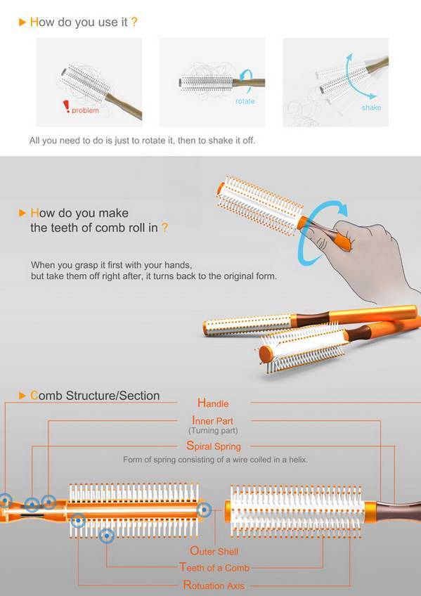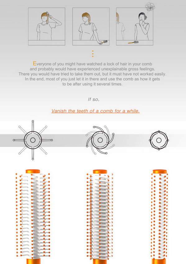 干燥的头发极其容易缠在发刷上,设计师为此提出了一个看似可行的解决办法:一把旋转伸缩发刷。如果过多的头发缠绕在发刷上,只需顺时针旋转握把,刷齿便会缩进管中,轻轻抖落便可清除烦人的毛发,这样是否方便多了呢?
