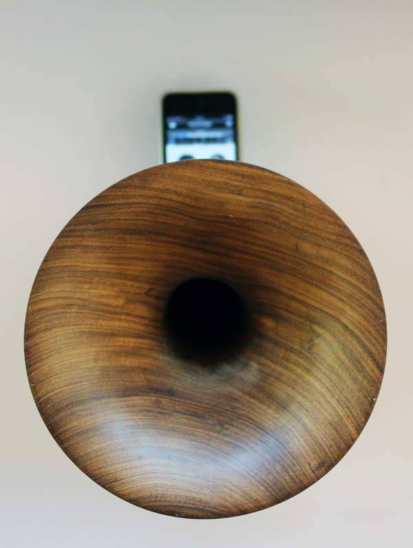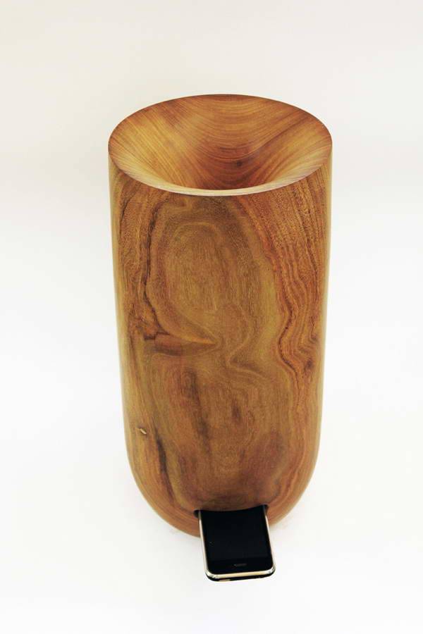 由荷兰设计师jeroen bomers设计的“bomie's boom system”是一款为智能手机量身定做的扬声器,由马拉维手工木刻和木工专家制作。它通过抛物面形的喇叭来优化放大音频输出。设计师在一段实木中刻出一条管道,使用者可以把手机插入底部的凹槽中,声音立马被放大到整个空间。