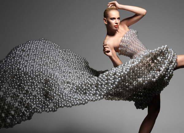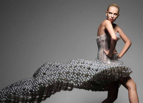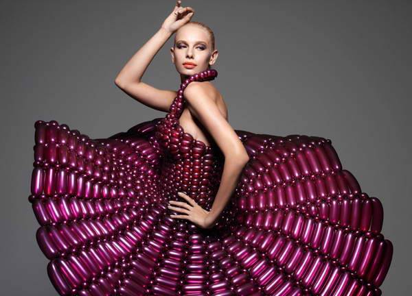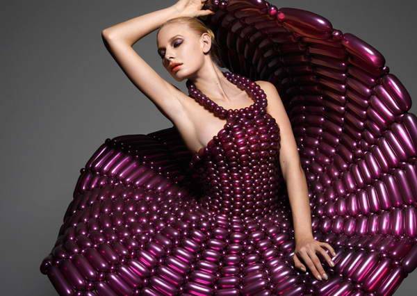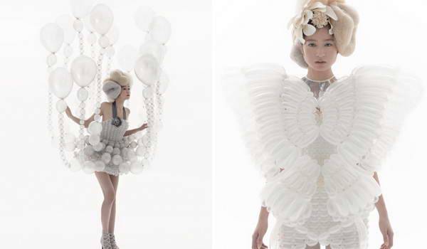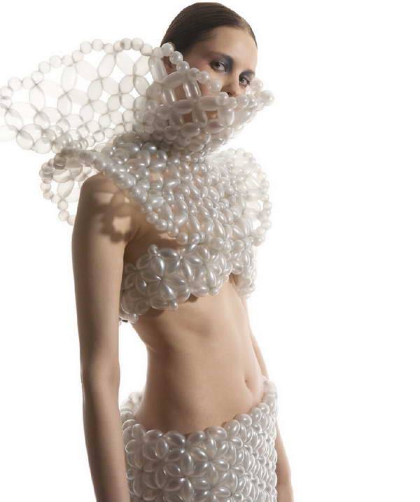 来自日本daisy balloon的气球艺术家细贝里枝(rie hosokai)用充气材料创作了一系列精致的服装,这些看起来根本不像布料的气球创造出了不同寻常的高级定制时装。最新一季的作品作为2013年1月9日在东京parco gallery举办的慈善艺术展 “piece for peace”的一部分,它们将和另一组用乐高积木制作的时装在一起展出。这些作品是艺术家用特制的气球“编织” 方法制作的,无数的小气球最终组成一件易碎的同时又具有可穿性的女装。