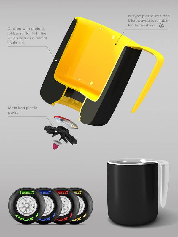来自设计师Behzad Rashidizadeh的创意,F1赛车咖啡杯(Pirelli Coffee Mug)会是每个车迷们这个冬天的最爱:采用双层设计,杯子外层是仿橡胶材质,让它看上去就像是一个宽厚的F1赛车轮胎(当然,你就不要去纠结这是干胎还是湿胎的问题了~),而内层则是安全的PP材质塑料,耐高温,直接放入微波炉也可以。