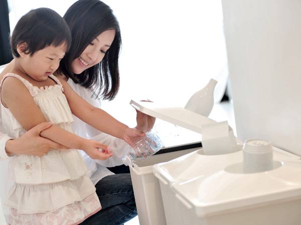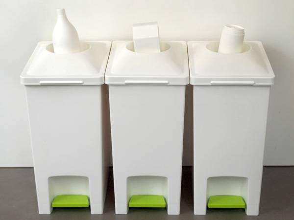 设计师设计的回收型垃圾桶,在垃圾桶的的顶部有着盒子、瓶子和易拉罐的样子,可以根据这个将手中的瓶子投入相关的垃圾桶方便回收。