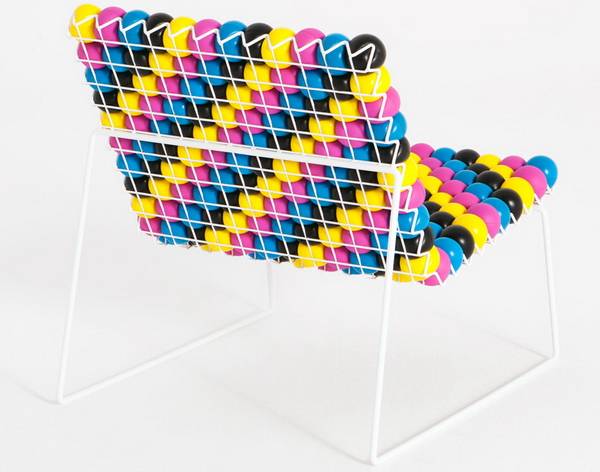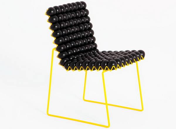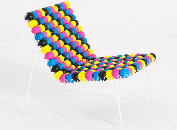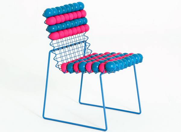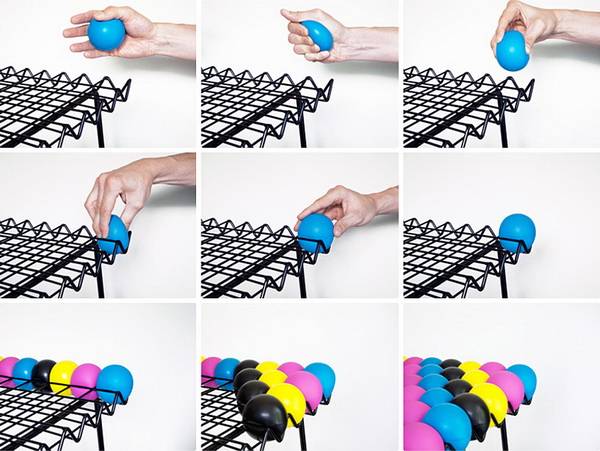 “Anti Stress Chair”是一件由上百颗应力球(stress balls)作为缓存靠垫,可以个性定制的框架座椅,由波兰设计师Bashko Trybek设计,法国厂商Outdoorz Gallery生产。椅子包括大小两款,为色彩涂层钢制框架,设有栅栏凹槽,用户可根据个人喜好购置不同色彩(红、青、黄、黑、白)的应力球,搭配出个性图案纹理。