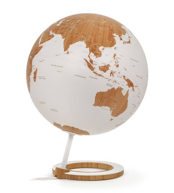 丹麦设计师kristoffer zeuthen最近设计了“竹子地球仪”。这个设计的目的是提高公众意识,尊重和保护我们的地球。这个直径25厘米的地球仪强调了环保是如何让地球变得更美丽。设计师将现代制图手法相结合到设计中选用了一种干净简洁的字体来标注。地球仪的表面是用竹子制作的,白色的钢杆作为地球仪的支撑杆,模拟了地球自然倾斜的状态。地球仪内部还装有灯泡,需要的时候,就可以变身成为一盏台灯。