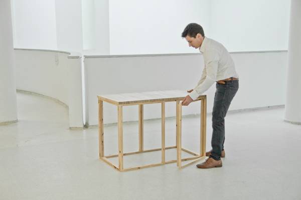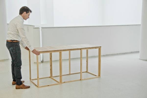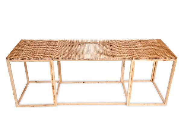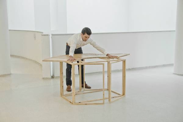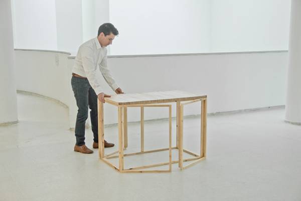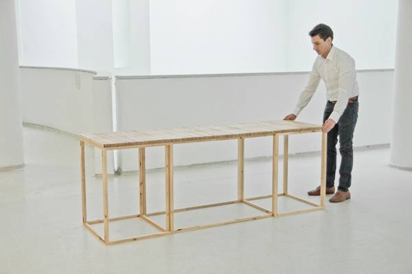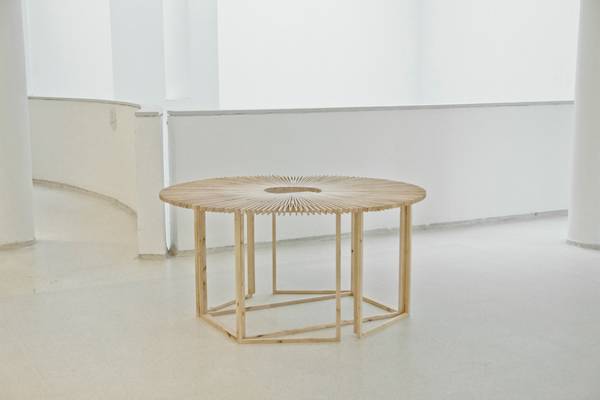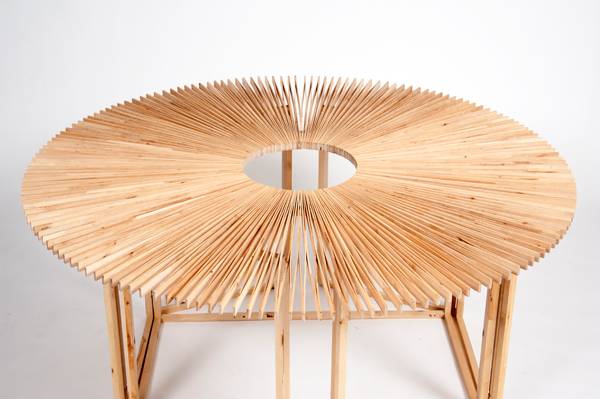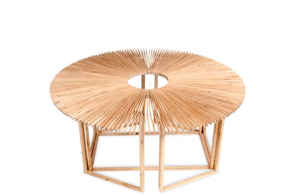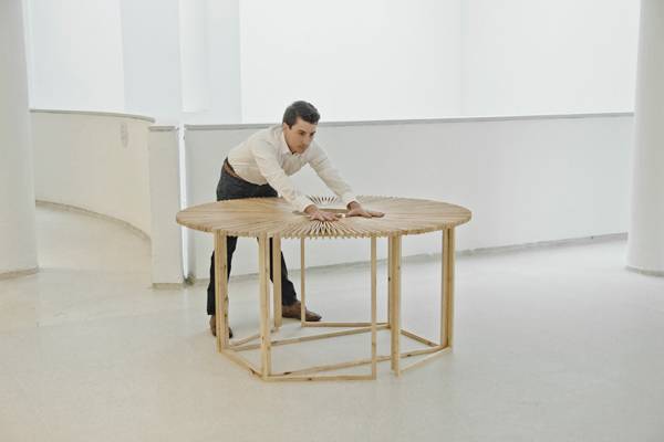巴西设计师Mauricio Affonso设计的FAN table(风扇桌), 桌面采用400多支桦木板条呈几何折叠构成,使其可以从方到圆自由变换外形。