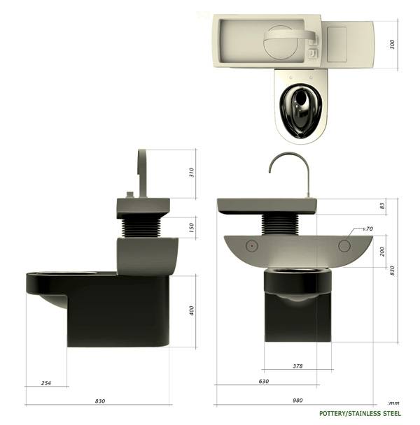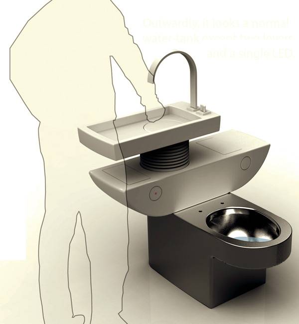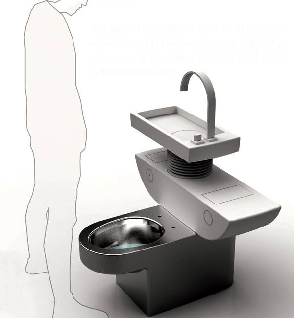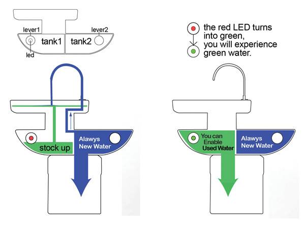 由Jang Woo-seok带来的一个水资源再利用的设计,将洗手池和马桶连接在一起,洗手后的水会流入到马桶的其中一个水箱,待装满时,红色的LED灯会变为绿色,提醒可用这部分水来冲马桶。另一个水箱则连接普通水管,我们可以像平常那样用水管里的水来冲马桶。