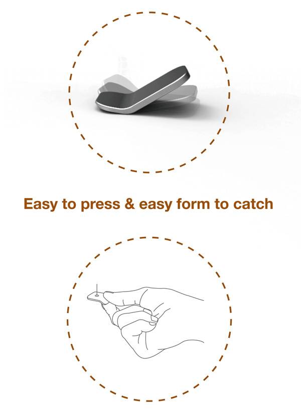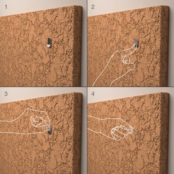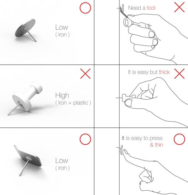 普通图钉按下去之后,要想重新拔出来是一件十分费力费心的事情,搞不好还会弄断指甲。设计师Junwon Yang设计了一款易拔图钉,将普通图钉的伞形圆顶变成一头稍微翘起的方顶,利用杠杆原理,按下翘起部分,图钉就出来了。