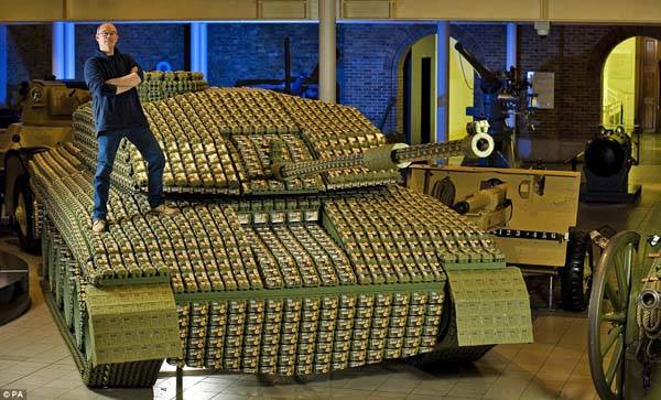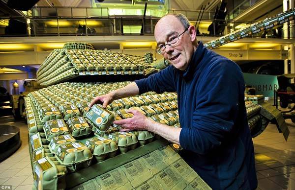 看起来像是很坚固的样子,但是它并不是上战场的,而是雕塑家 Sculptor Stuart 利用5016个鸡蛋盒,花费了512个小时组装而成,其他的材料则用了26公升的胶水,10100个钉子,15升油漆,5103枚订书钉,80平方米钢铁,他创作这个坦克的用意,是每销售一盒鸡蛋,捐助15便士给慈善机构,帮助那些受伤的军人或者他们的家属。