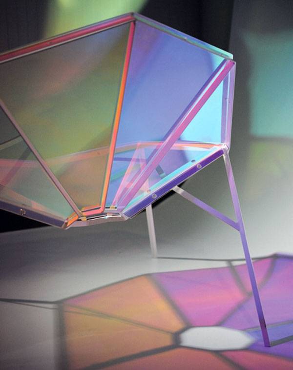 温馨简洁的室内装饰能让人放松心情,而一把与众不同的座椅则可以彰显主人的别样情致。这把八角形座椅由八块颜色不同的树脂玻璃制成,这种玻璃独有的双色性与反射性,使得当光线照射时会在地面投射出多彩而绚丽的颜色,宛如平铺于地面的彩虹一般。而且随着光线角度、强弱的变化,或观看者视角的不同,座椅投射的颜色也会有所变化。此外,站在特殊的角度时,座椅玻璃面还会像镜面一样反射周围环境,十分奇特。