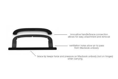 这是一款让手提电脑可以真正“手提”的小装置,它充分利用电脑屏幕与转轴之间空隙与电脑闭合后它们之间的挤压应力,使用时只需将提手端从缝隙中塞过去,然后再套上塑料提手即可。这款产品简单便捷,不过目前它的使用对象仅限于Mac Book Pro。