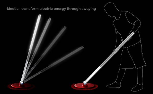 一个有趣的概念设计,这是一盏落地灯,另外它还是拖把。没有外接的电源,想要点亮这落地灯,那我们必须劳动,先让它变成拖把的角色,通过动能转化变成电能,灯也就点亮了。