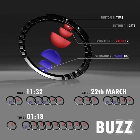 手表是我们日常生活中经常需要用到的产品,通常,我们利用眼睛读数来获得时间概念。如今,Buzz手表打破了这一通过观看才能了解时间的传统,这款由Tamas设计的产品没有以往手表的指针键盘设计,取而代之的是LED信号处理系统和感应振动器。用户在使用时不需要去读取表盘而是通过其振动模式即可获得准确的时间点。
