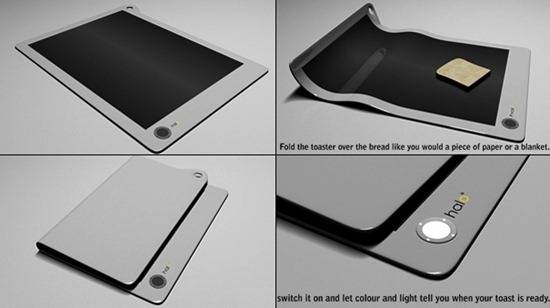 这是一台很梦幻的烤面包机,把那个叫做“机”的方方正正呆头呆脑的大盒子扔进垃圾桶,试试这个可以卷曲折叠的“魔毯”吧,只要把吐司片放上去,将魔毯对折,等到表面的指示颜色变红的时候,就可以享用双面焦黄的吐司了。它小巧玲珑可以卷起来随身带走,或是折叠一下挂在墙上。呃,我想说的是,如果还可以在上面煎鸡蛋或是来个铁板烧,那就完美了!