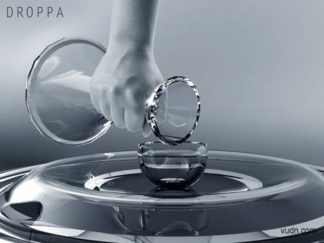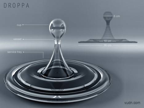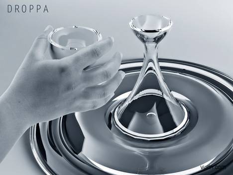 设计师将该玻璃杯设计成了一个凝固的水滴形状。这款名为DROPPA的玻璃杯,其上半部分水滴形状的是个杯子设计,接着才是个玻璃瓶子,最下面是托盘。整套设计给人以一点点性感的感觉。