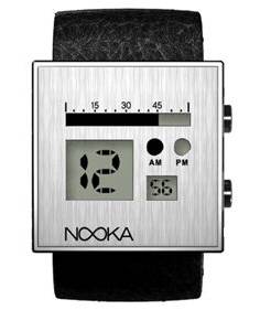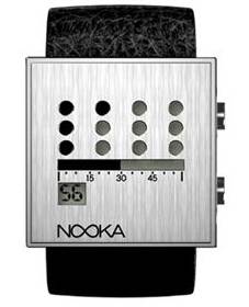 nooka zoo,nooka zot由Marrhew waldman 设计,不锈钢和皮革表带,防水,限量1000款 价格:250美元。这两款手表的创意之处在于,时间的表现方式,如zoo,秒的显示,采用类似水银注的方式。zot更具创意,表面上由12个圆点,几个点就表示几点。