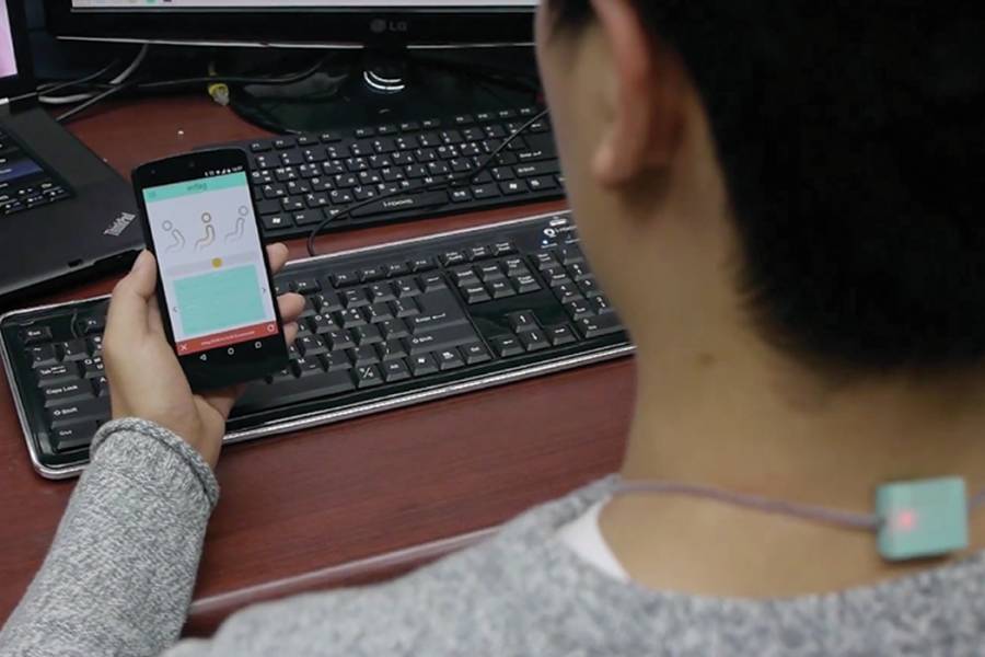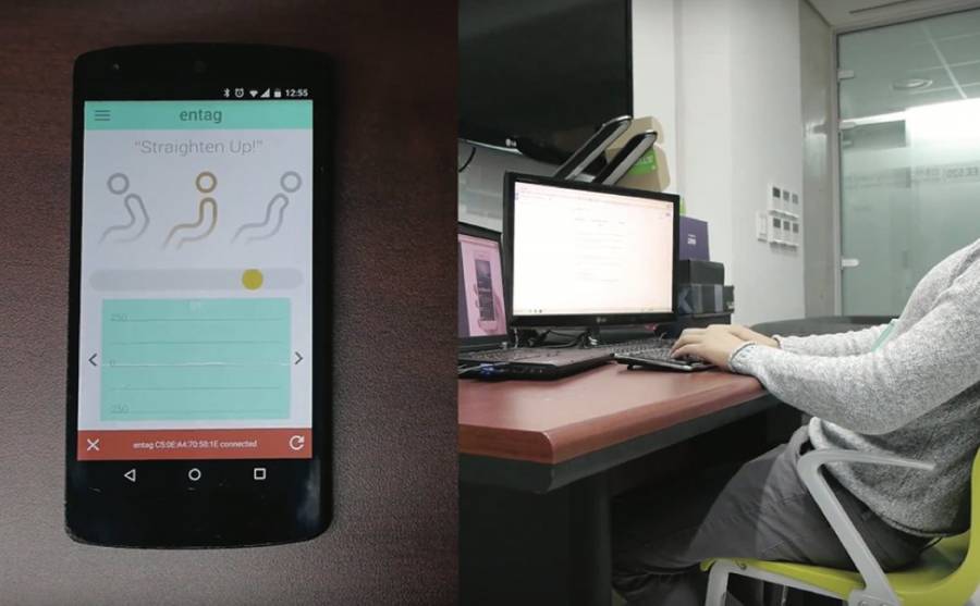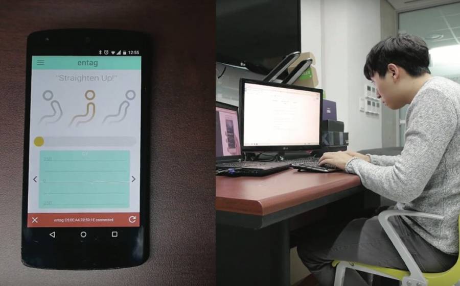 办公桌前久坐又不注意姿势很容易影响到脊椎的健康,为了让上班族们能够意识到坐姿的重要性,设计师 Jihoon Suh 和 Yongdae Kim 设计了一款名为 Entag 的智能卡套,提醒大家注意坐姿,实时进行调整。它的外观是一个大家经常用的卡套,这样的设计也是出于上班族必带员工牌。关键的地方在于绳带上内置了坐姿感应器,它紧贴在颈椎部位,可以感应到颈椎是否过度前倾或出现错误的坐姿等。内置蓝牙与智能手机相连,通过配套的 APP 随时查看坐姿状况,当坐姿不正确的时候,它还会通过 APP 进行提醒,从而达到帮助矫正坐姿的目的。