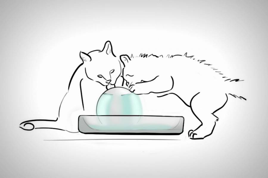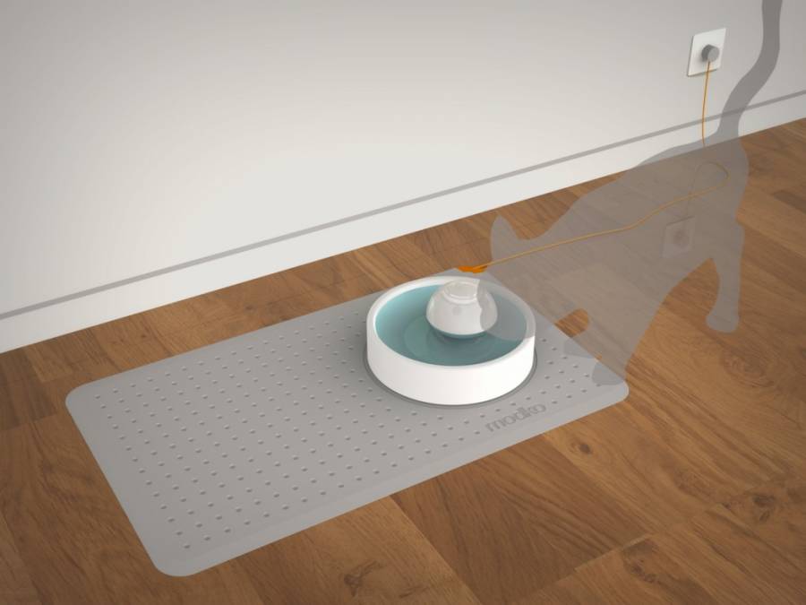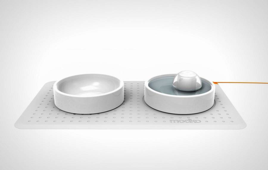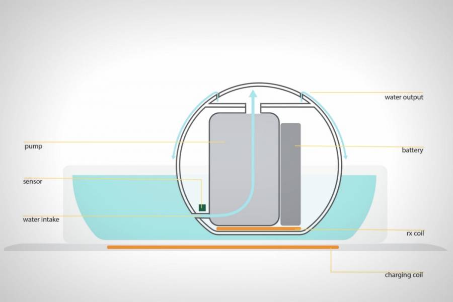 这是一款专为独自在家的宠物设计的水盆BobbleKat Fountain,水盆里的球体内置了感应器、水泵以及电池,底部和与它配套的垫子都配有线圈,可以为电池充电。一旦它感应到猫咪过来喝水,它就会将水引导至球体顶端,顺着表面流下供猫咪饮用。