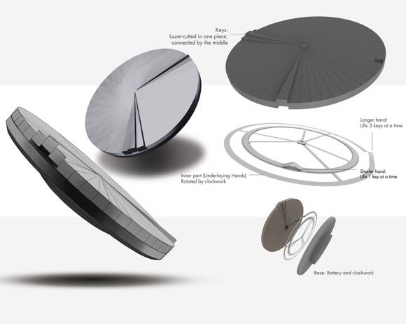 这款名为 Tectonic clock 的时钟是设计师Andreas Vang带来的的概念设计。它的表盘就像是由钢琴键排列而成,按键彼此交错起伏。最外层被分成了60 个板块,会根据时间变化凸起并在表面形成阴影。其中单独凸起的那一块表示分针,三块同时凸起时中间那块则代表时针。