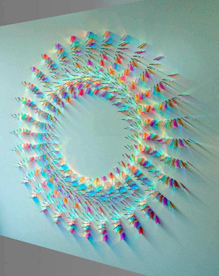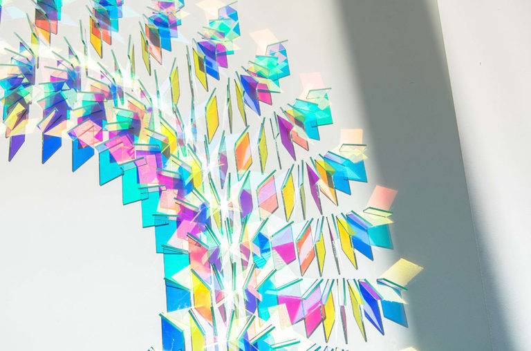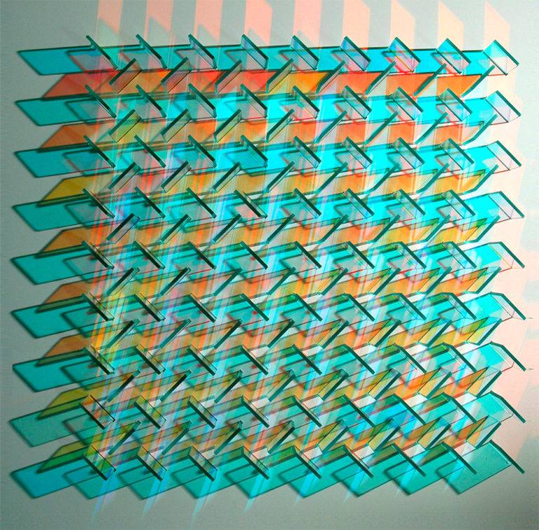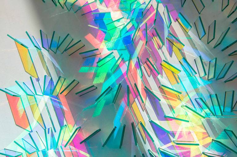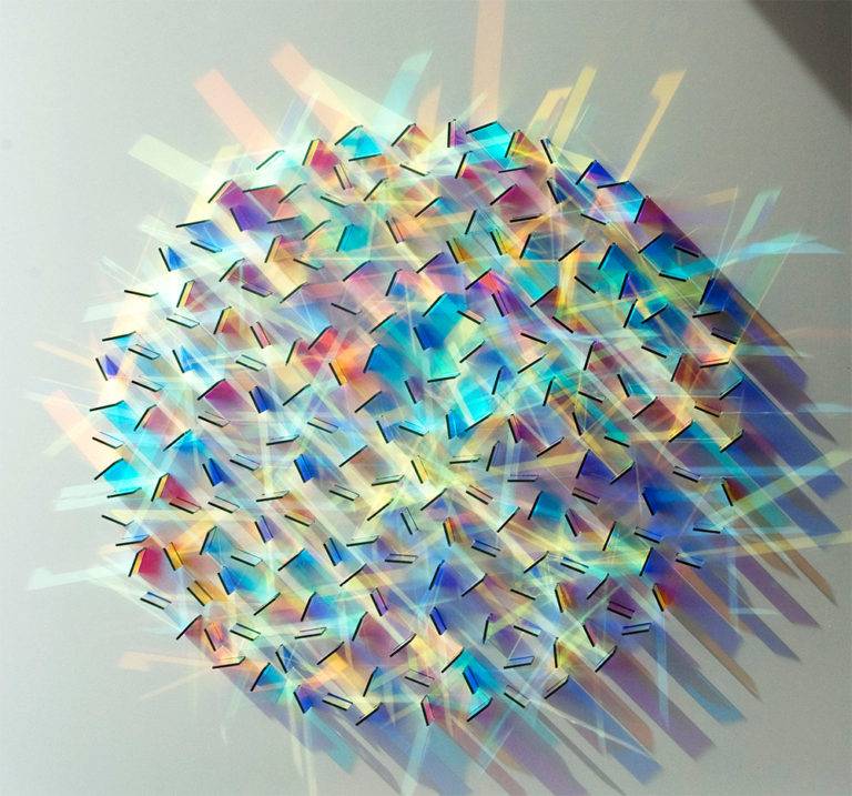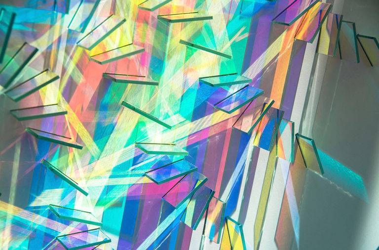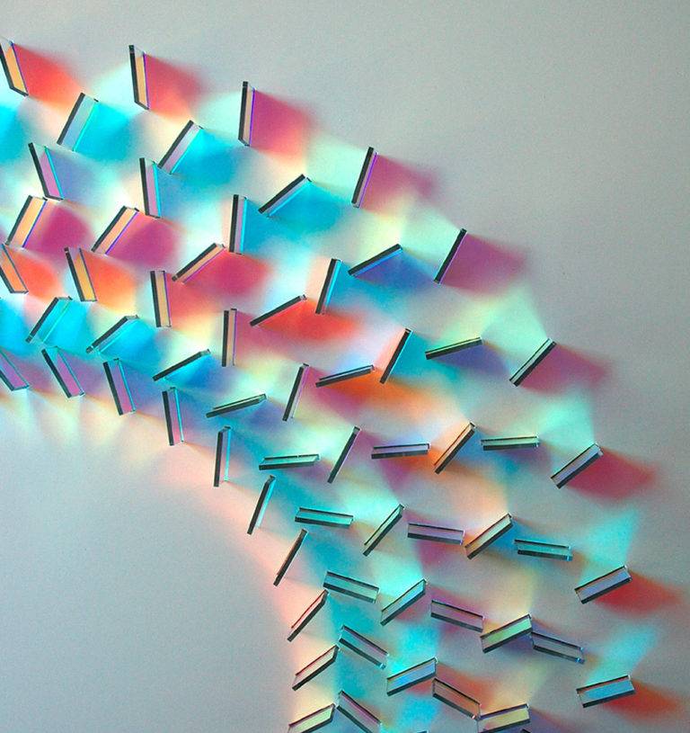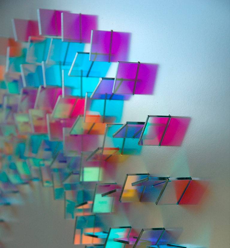 总部位于英国的艺术家克里斯伍德使用二向色玻璃面板制作艺术装置,产生迷人的照明效果。