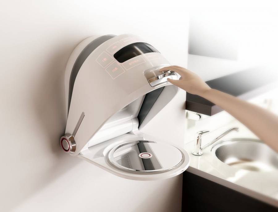 设计师Choi Yousong设计了一款可以直接挂在墙上的新式微波炉,它采用了圆形设计,看起来和平时长方体的微波炉不尽相同,本身体积更小,减少了空间的占用。微波炉后部预留了安装专用孔,无需单独使用壁挂支架,通过标配的膨胀螺丝等配件,就可以牢固的安装在墙上不会掉落。不使用的时候,可以将微波炉掀起,就起到了收纳的作用。在使用的时候,将微波炉的盖子轻轻掀起,就能够看到微波炉的转盘。和传统微波炉一样。它采用了触摸式的按键,可以设定火力大小和加热时间,满足加热不同食物的需求。