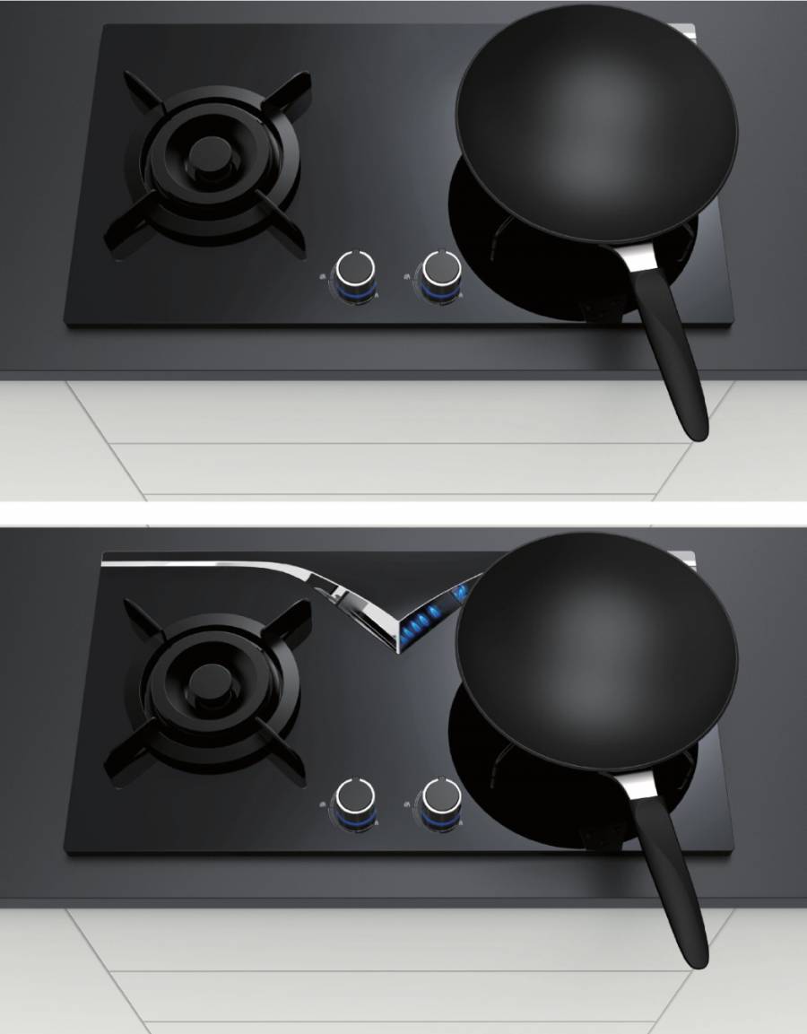当我们把锅放在普通的炉灶上,一般需要弯腰才能查看火焰的大小。而这款55°mirrorhob燃气灶一个小的设计细节提升了用户体验,它在两灶台之间增加了一个V型的反光条,这个反光条可以将你观察火焰的视线不再被炉上的锅所遮挡,而是直接可以从反光条中查看。