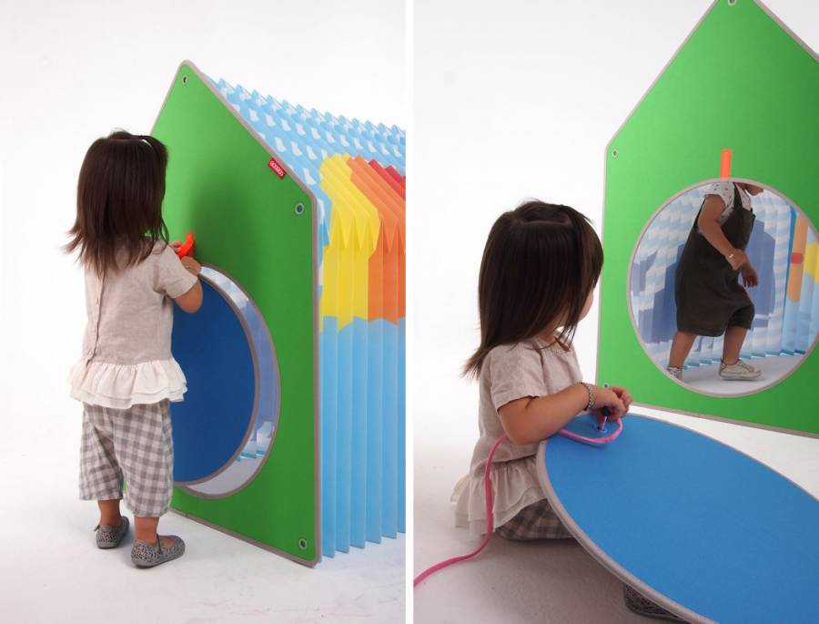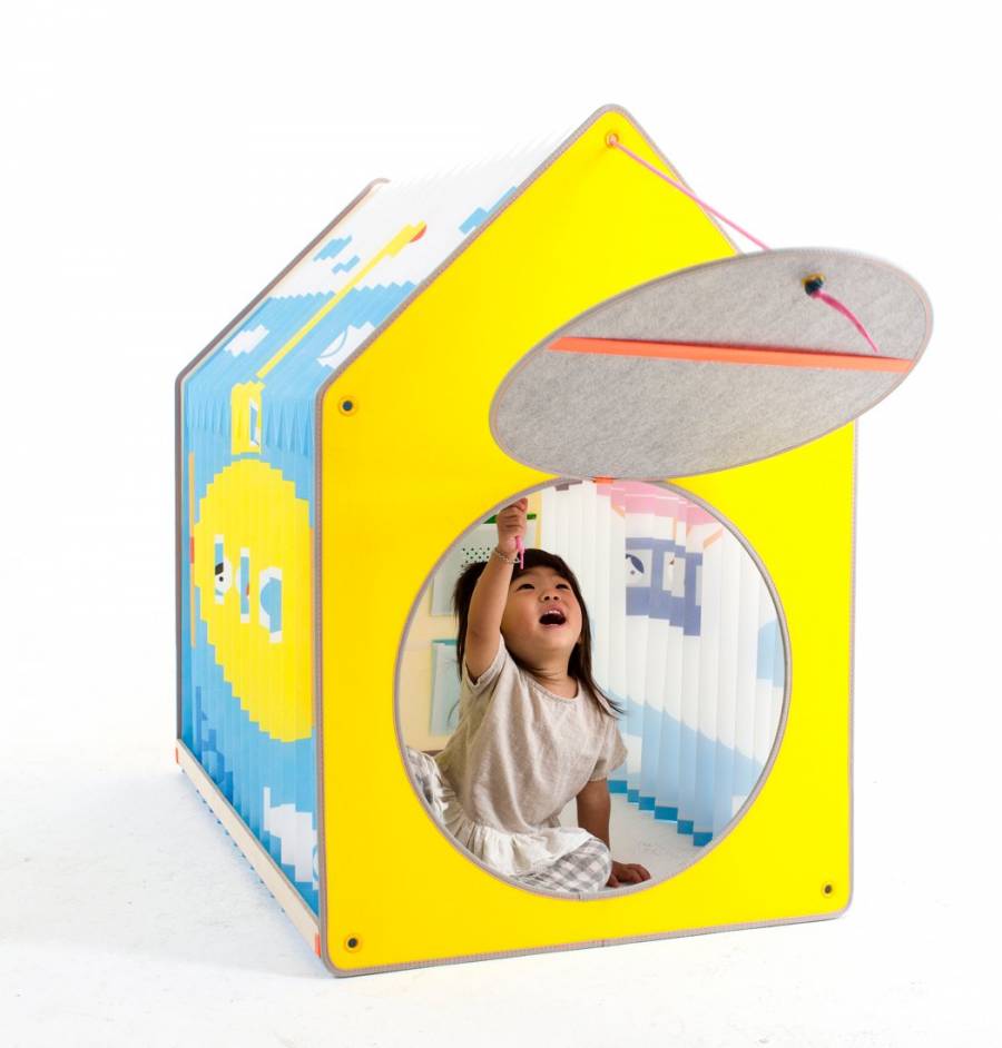 这是一款采用手风琴式设计的儿童玩具小屋,不用时可折叠存储,使用时可根据需要随意拉伸,改变大小,小朋友可以体验不同大小的空间,让他们的想象力也丰富起来。