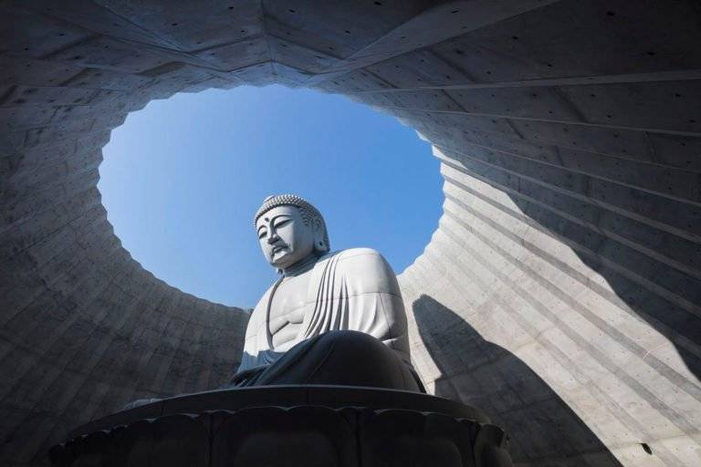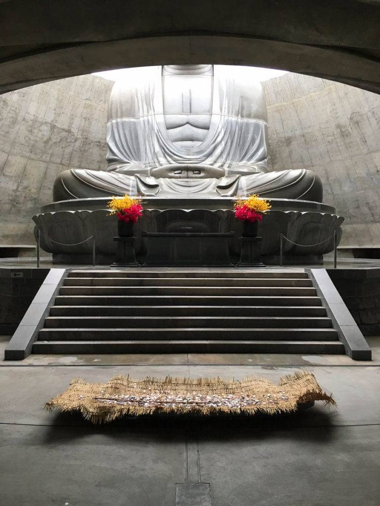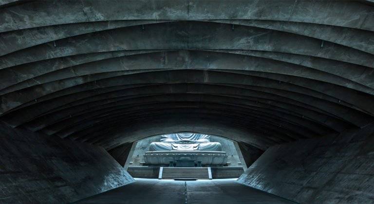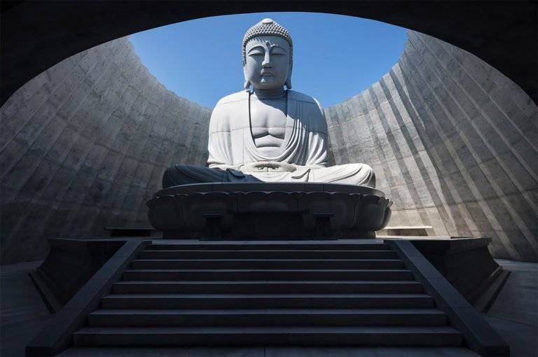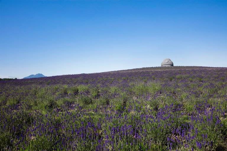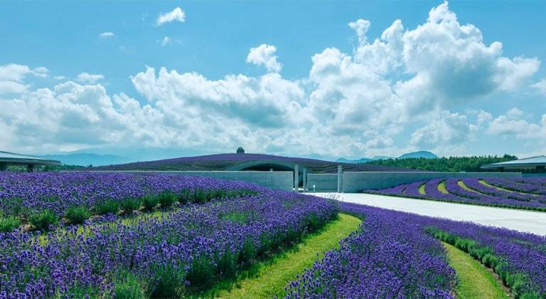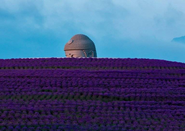 日本建筑师安藤忠雄在札幌设计了一座迷人的寺庙,在薰衣草植物中美丽地覆盖着一座巨大的佛像石像。