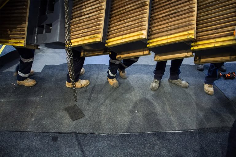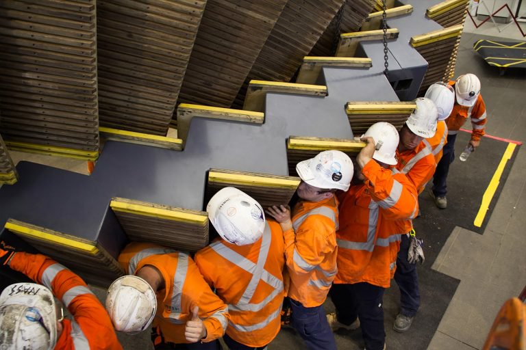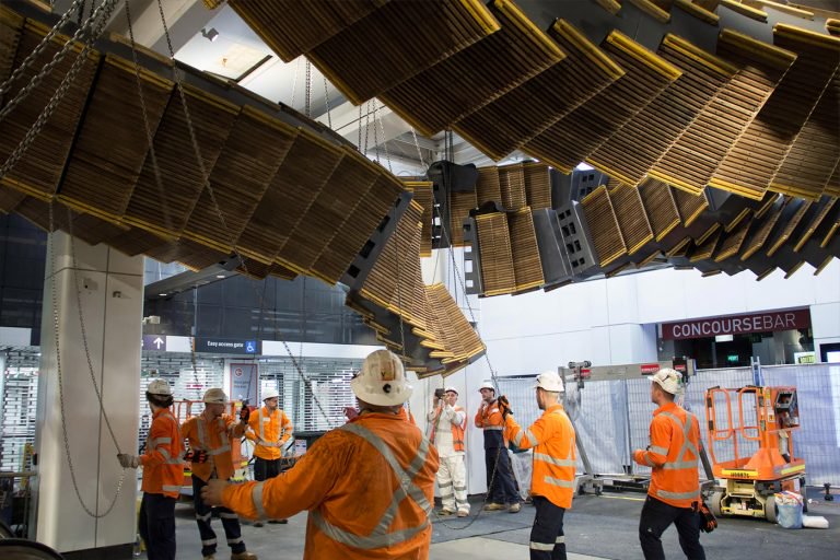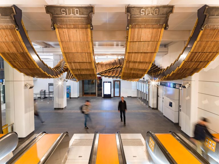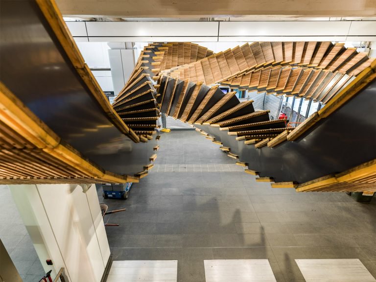 澳大利亚艺术家克里斯福克斯使用80年历史的木制自动扶梯创作了这座巨大的雕塑,现在从澳大利亚悉尼的Wynyard Station天花板悬挂下来,直接悬停在现代金属对象的正上方。