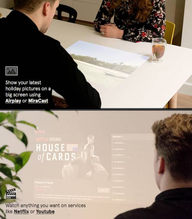 Beam是一款可以投影手机平板内容的LED灯,机身上有个按钮可以在投影与照明模式中切换。它的底部螺纹与普通灯泡相同,可以安装在任意地方。Beam支持Wi-Fi和蓝牙,机身8G的内存,还有两个2W 的小喇叭。用户将灯泡安装好后可通过手机APP实现屏幕内容的投影。总之有了它你可以躺在床上看电影,在厨房边做菜边看投影的菜谱,或者把照片投影到桌子上与朋友分享等等。