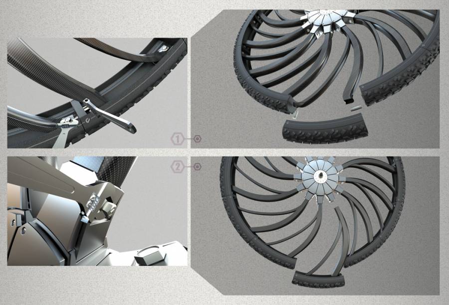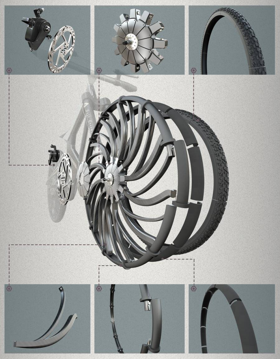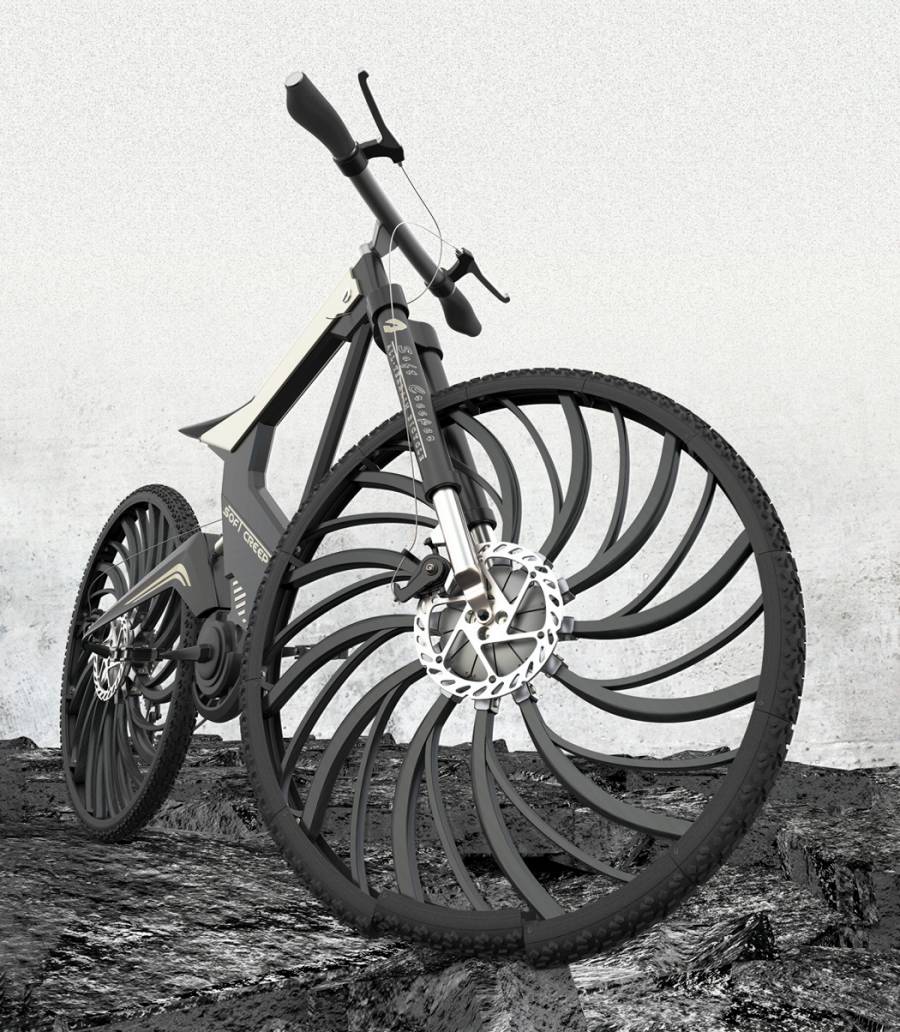 自行车的避震结构通常安装在前叉或车把处,而这辆车却独辟蹊径,在轮毂上做起了文章。相比于固定轮辐,该车轮使用具有一定韧性与刚性的人字形支撑结构,在平地上可以正常行驶,遇到凸起物只会挤压特定的部位,引发形变,从而起到缓震缓冲的效果。