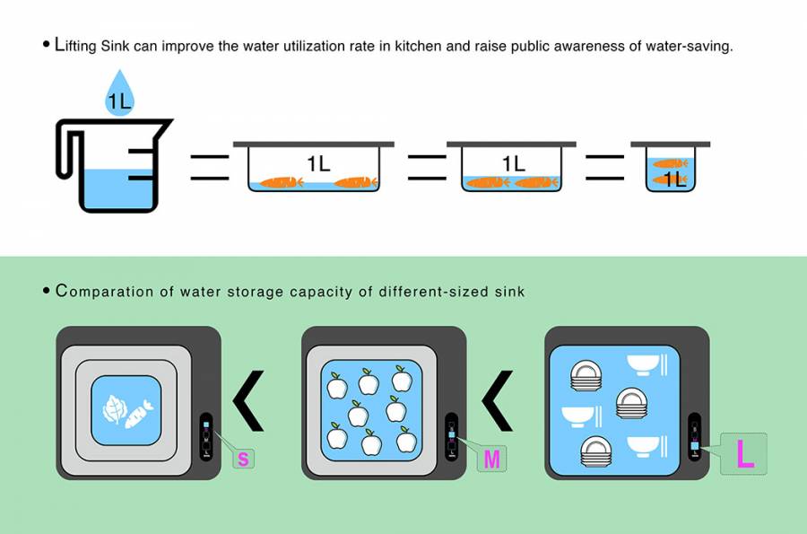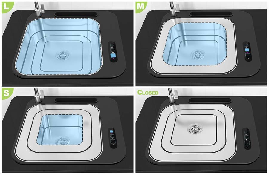 这款升降式水槽可根据洗菜量的多少来决定用多大的水槽,避免水的浪费。它相当于是三层金属框的嵌套体,从大到小,你可以根据需要选择大、中、小三种尺寸的水槽。这样再也不会出现为了洗一点点菜却放了一大盆水的情况。