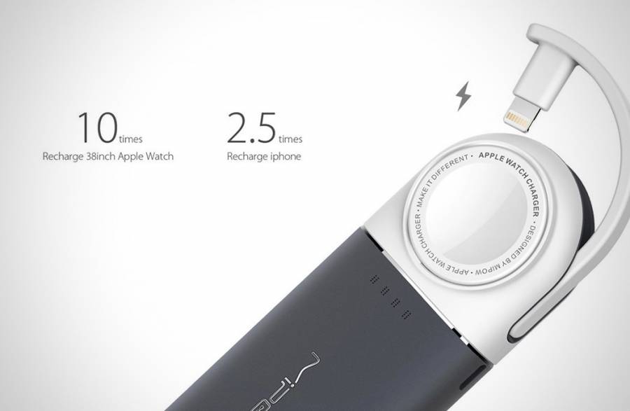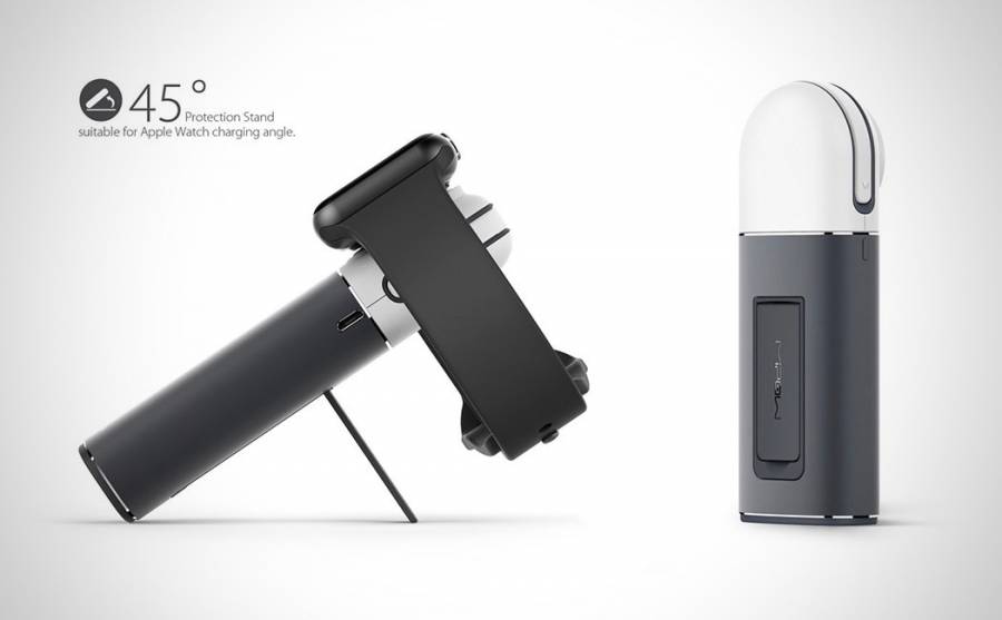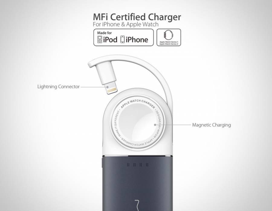 这款移动电源最大的特色就在于为苹果系产品提供了一站式充电解决方案。它配有两个充电端口,一个是内置的Lightning充电线材,另一个是苹果认证Apple Watch磁力充电模块,可以为Apple Watch进行无线充电,并为iPhone、iPod Touch直接充电,也同时给两部移动设备充电。而Lightning充电线材正好隐藏在半圆形的结构里面,隐藏式的设计好处良多,首先是保护线材,二是可以节约空间。