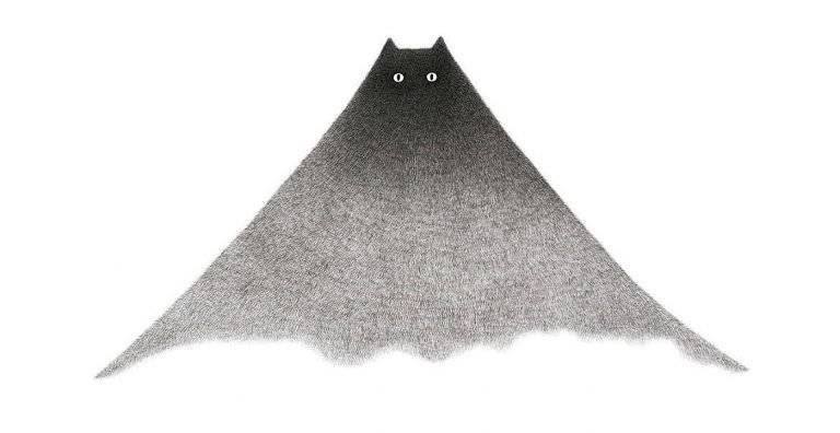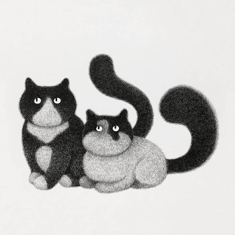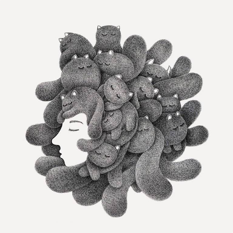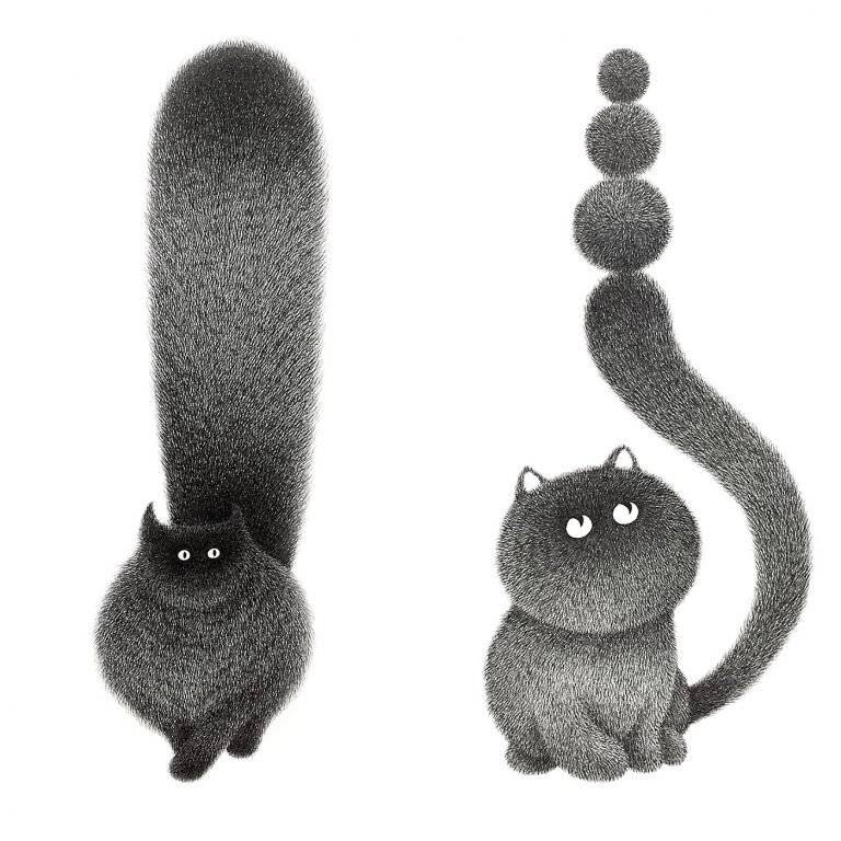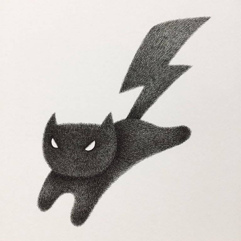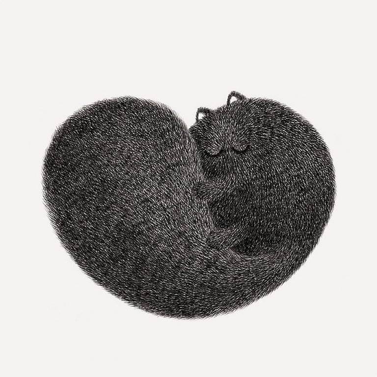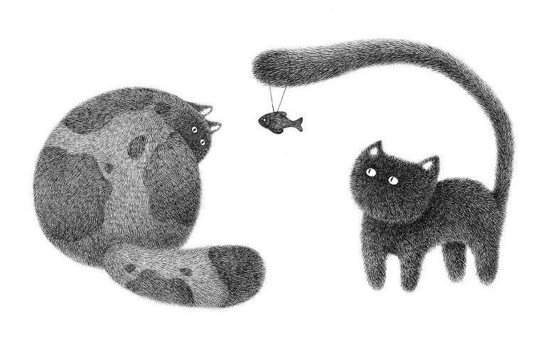 马来西亚艺术家Kamwei Fong用黑色墨水制作蓬松猫的可爱插图。