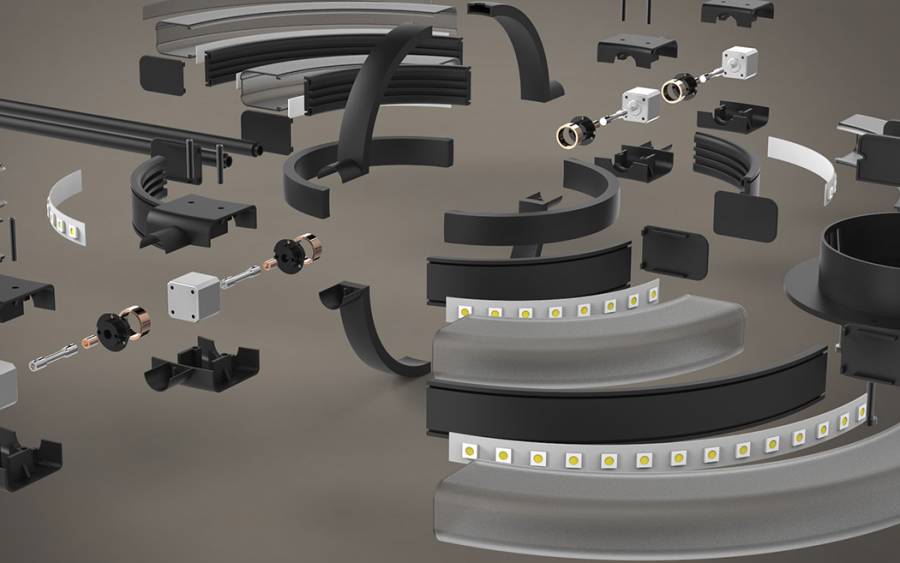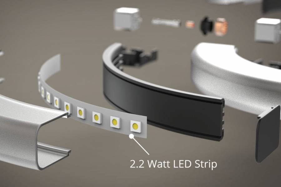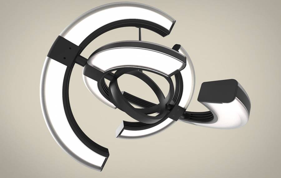作为吊灯时,Saturn 的确无所谓角度,但在作为挂钟时,就要从正面或后面来看——在这两个角度,我们会看到大、小灯管未被黑条遮挡的发光部分充当了分针和时针,而中央两个圆环形成的十字刚好指出了 12 点、3 点、6 点和 9 点方向。四根灯管/表针均由步进电机驱动,而这些电机由位于安装座内的微控制器控制。